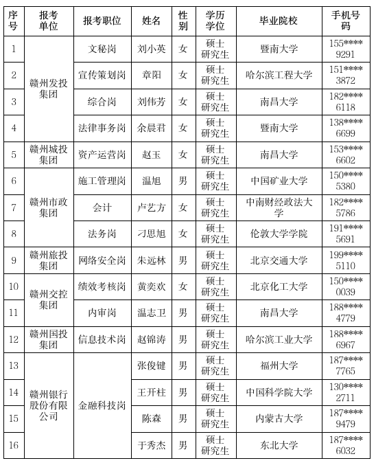 根據(jù)《關(guān)于舉辦2024年贛州市“引才聚贛州 攜手創(chuàng)未來”組團(tuán)引才暨“雙招雙引”活動(東北站)的通知?》,經(jīng)報名、資格審查、面試、背景調(diào)查及體檢等程序,現(xiàn)將贛州市屬國企2024年組團(tuán)引才(東北站)擬錄用人員名單公示如下: