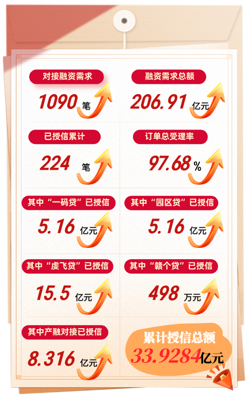 融資服務提質(zhì)增效。截至目前,平臺運行11個月來,對接融資需求1090筆、對接融資需求金額達206.91億元,銀行受理率達97.68%。其中“園區(qū)貸”“虔飛貸”等特色產(chǎn)品精準服務小微企業(yè)、科技企業(yè)等重點群體,市場認可度持續(xù)提升。