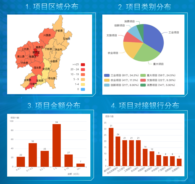 產(chǎn)融對接創(chuàng)新突破。在2025年第十一屆江西省金融機構支持贛州市經(jīng)濟高質(zhì)量發(fā)展產(chǎn)融對接活動中,首次通過數(shù)字科技為金融服務賦能,實現(xiàn)了產(chǎn)融對接項目數(shù)字可視化,為大會的順利召開提供了堅實的技術支撐與保障。集成動態(tài)數(shù)據(jù)統(tǒng)計與可視化展示模塊,實現(xiàn)261個項目、559億元融資需求的線上實時查看;其中已簽約項目162個,簽約金額388億元,推薦項目完成授信8.316億元,展現(xiàn)了國企在促進產(chǎn)融結合中的樞紐作用。