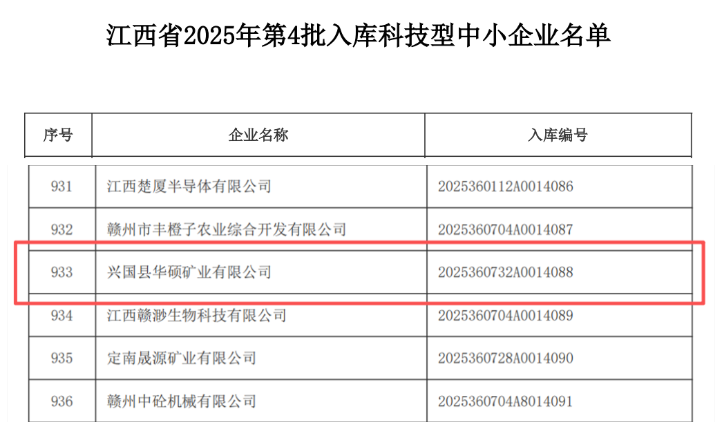 近日,贛州工控集團旗下興國縣華碩礦業(yè)有限公司(簡稱:興國華碩礦業(yè))成功入選國家科技型中小企業(yè)名單(入庫編號:2025360732A0014088),標(biāo)志著企業(yè)創(chuàng)新實力獲國家認可,正式躋身國家級科技企業(yè)培育核心梯隊。