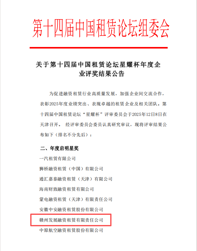 近日,第十四屆中國(guó)租賃論壇在天津舉行,會(huì)上揭曉了“星耀杯”年度企業(yè)評(píng)選結(jié)果。贛州發(fā)展融資租賃有限責(zé)任公司憑借在產(chǎn)業(yè)轉(zhuǎn)型及行業(yè)貢獻(xiàn)方面的突出表現(xiàn),從眾多候選企業(yè)中脫穎而出,榮獲“年度啟明星獎(jiǎng)”。